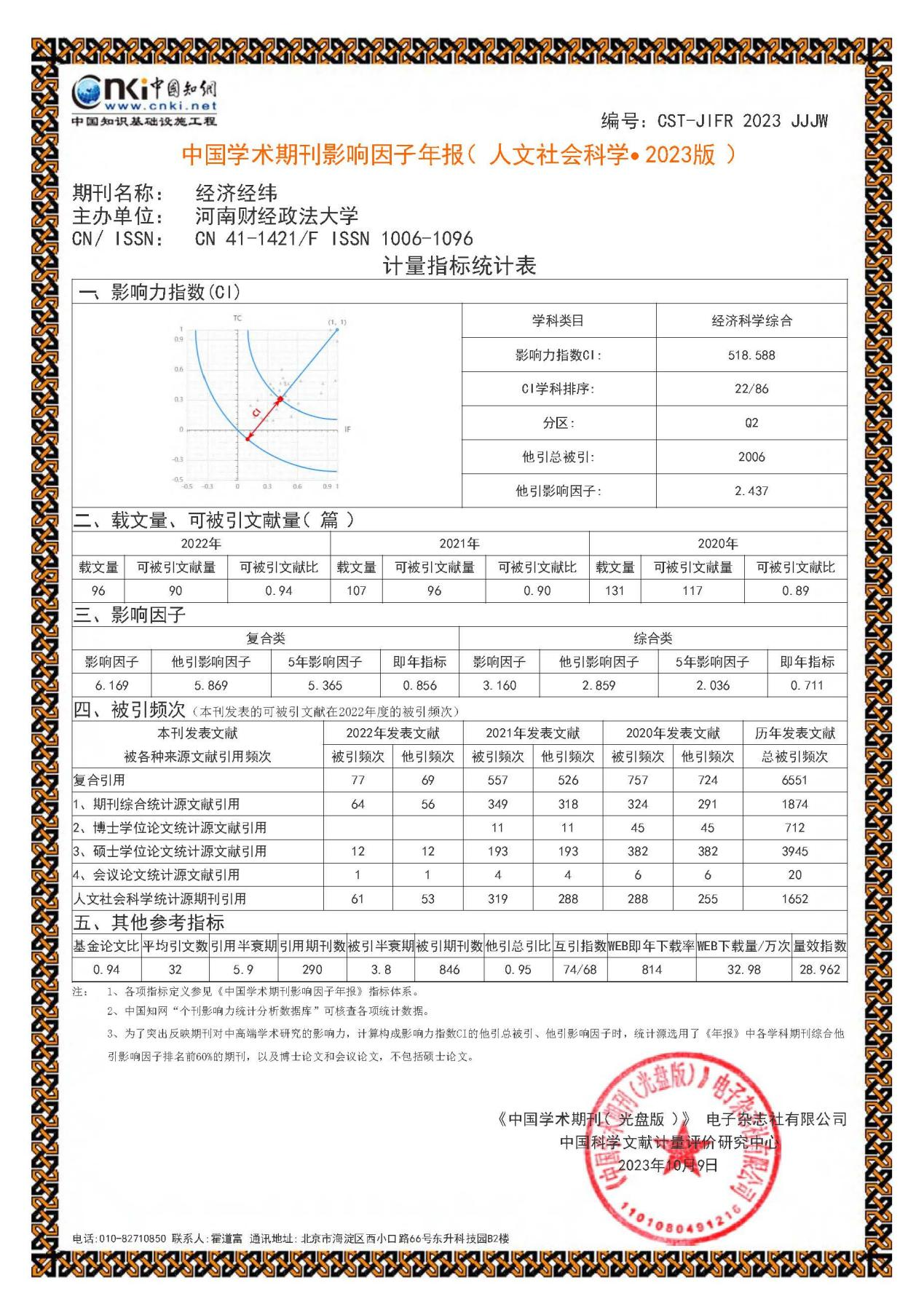 2023年10月,《中国学术期刊(光盘版)》电子杂志社有限公司与中国科学文献计量评价研究中心联合发布《中国学术期刊影响因子年报(人文社会科学·2023版)》,《经济经纬》影响因子继续提高。《经济经纬》2022年的复合影响因子为6.169,综合影响因子为3.160。相较于2021年,复合影响因子提高13.90%,综合影响因子提高16.69%。我刊办刊质量再次得到学术界和评价机构的认可。