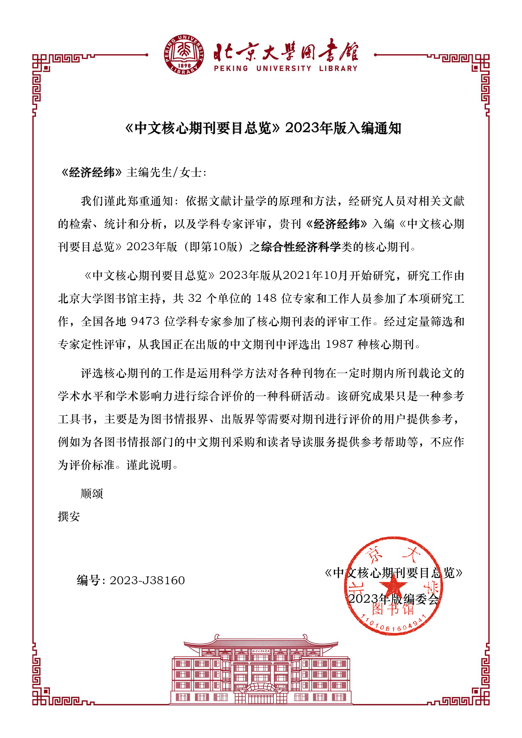 近日,北京大学“《中文核心期刊要目总览》2023年版编委会”正式通知,依据文献计量学的原理和方法,经研究人员对相关文献的检索、统计和分析,以及学科专家评审,《经济经纬》再次入编《中文核心期刊要目总览》2023年版(即第10版)之综合性经济科学类的核心期刊。