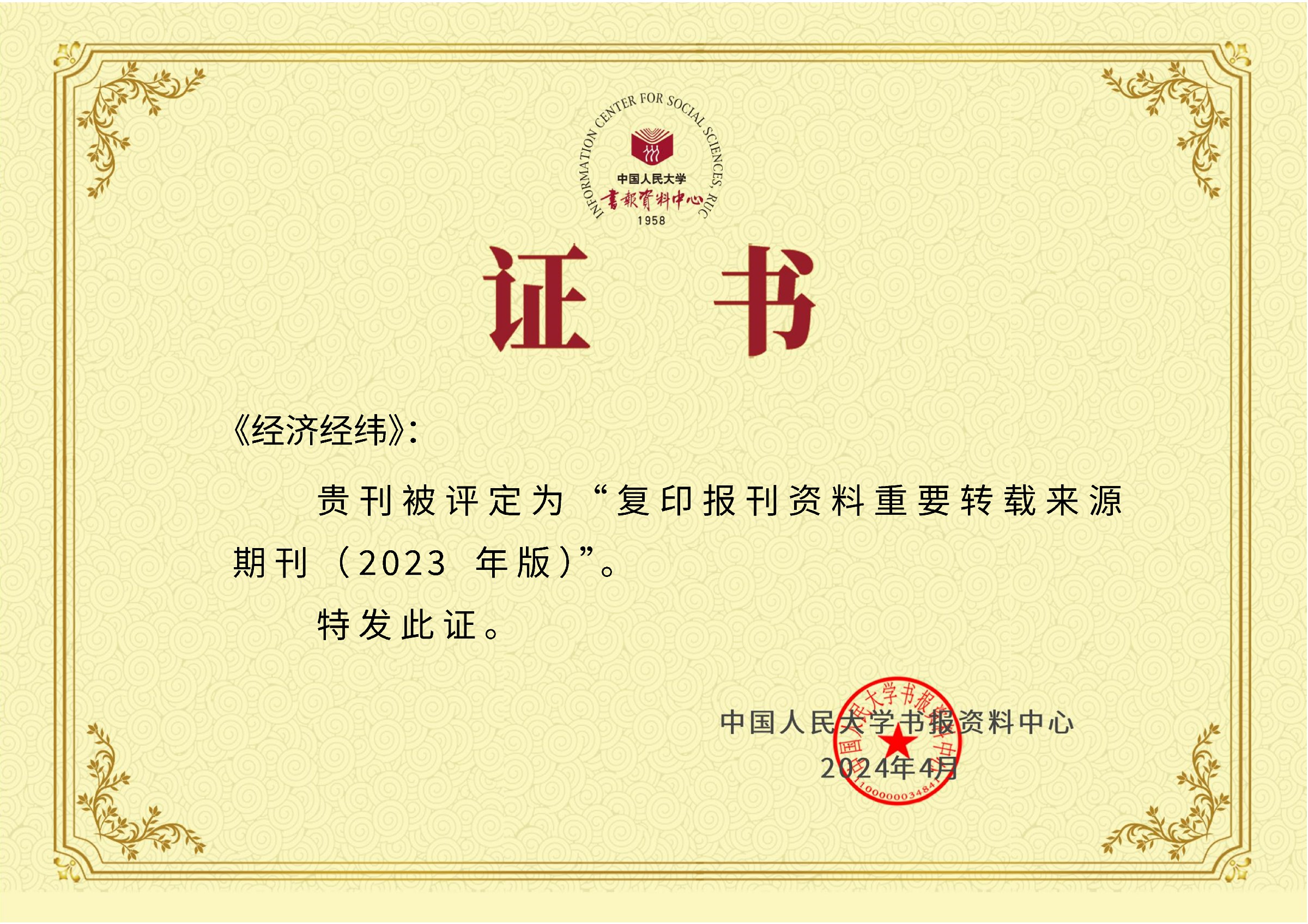 4月25日,中国人民大学复印报刊资料转载指数发布暨中国自主知识体系建构与学术期刊发展研讨会在北京召开。会上,《复印报刊资料重要转载来源期刊(2023年版)》正式发布,《经济经纬》再次入选。